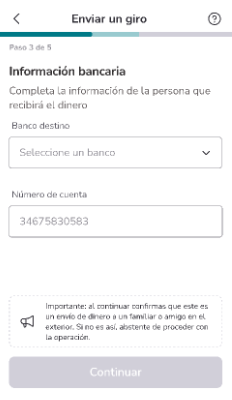 1.Selecciona la opción "enviar un giro" y el país al que quieres enviar, luego haz clic en continuar